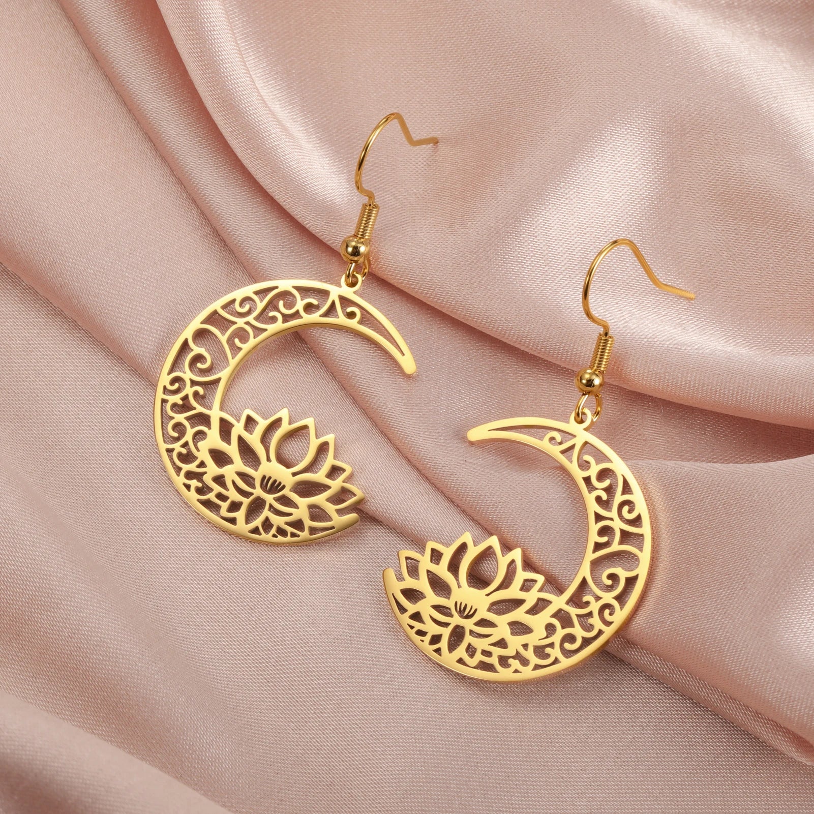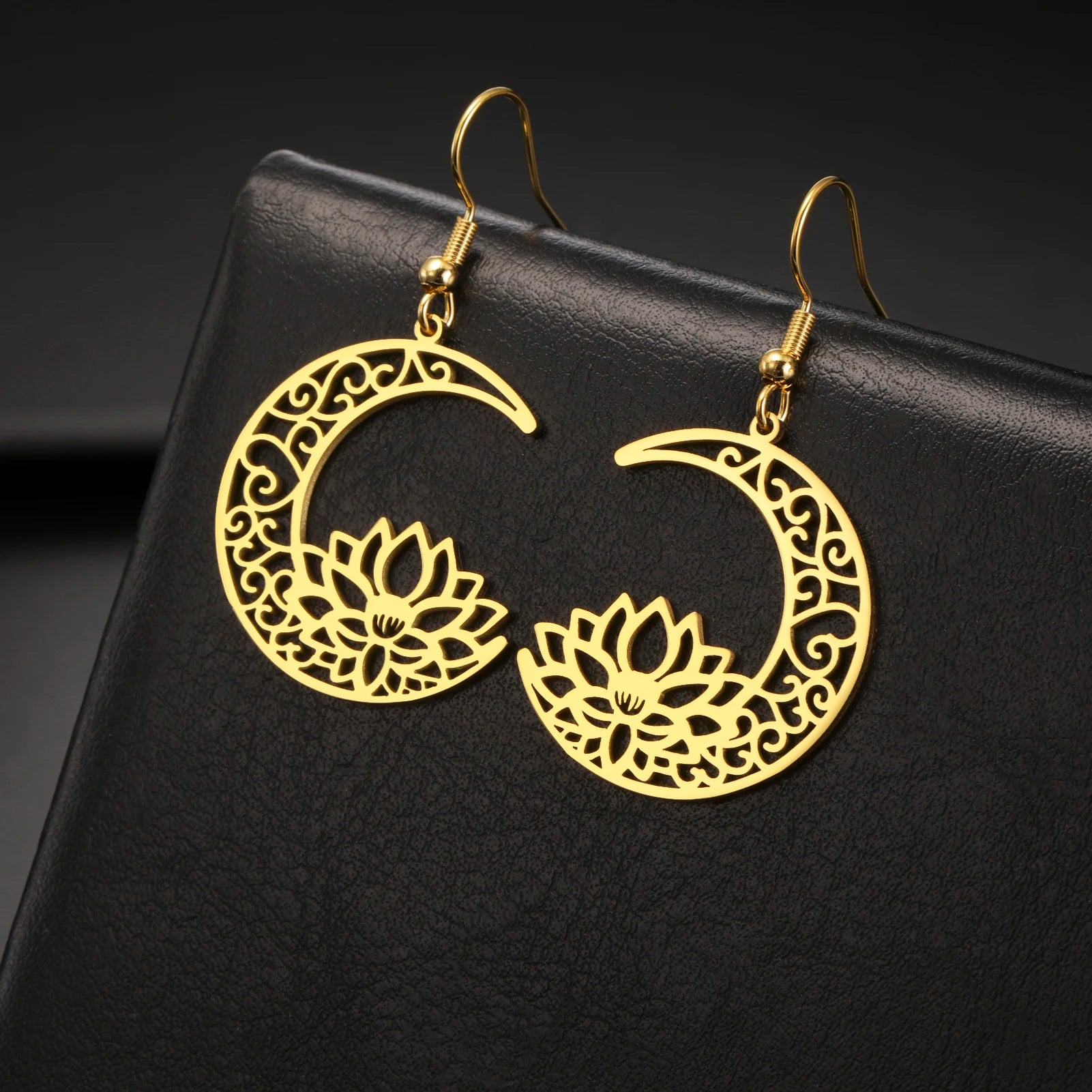 Nos boucles d'oreille acier inoxydable associant croissant de lune et fleur de lotus vous transportent dans un univers de symbolisme et d'élégance.